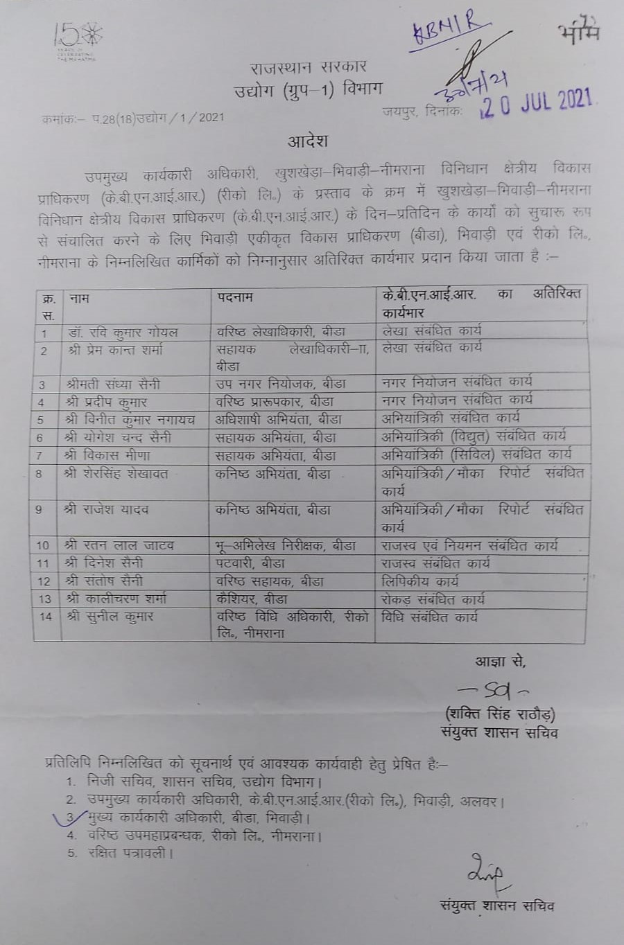 | 6. | Additional work order of officials of BIDA, Bhiwadi and RIICO, Nimrana | 20/07/2021 |