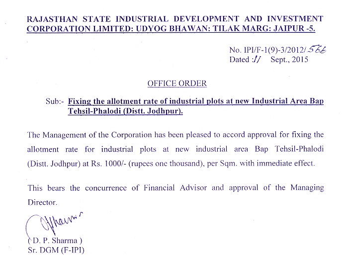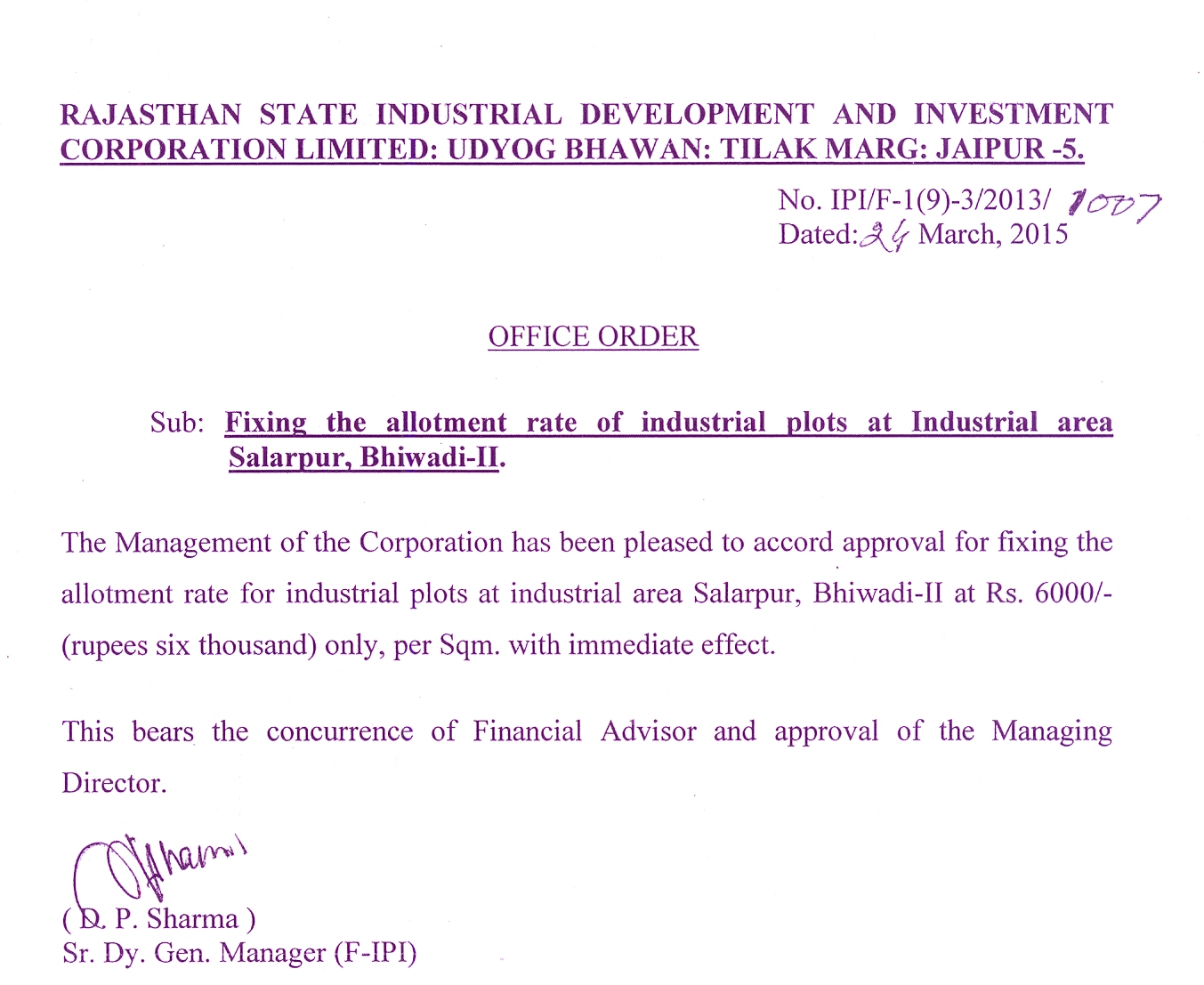 Fixing the allotment rate of industrial plots at Industrial area Salarpur, Bhiwadi-II