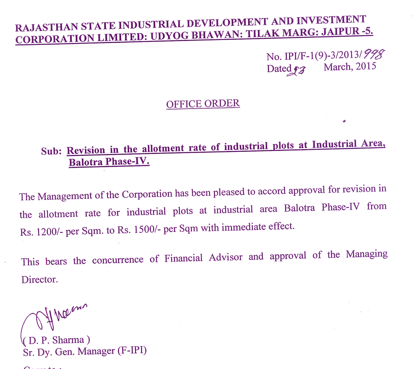 Revision in the allotment rate of industrial plots at Industrial Area, Balotra Phase-IV