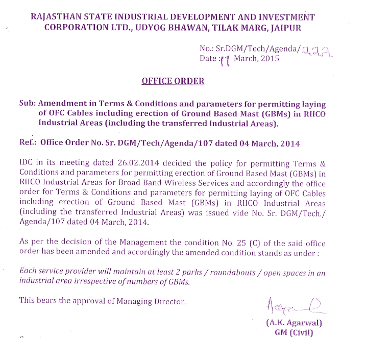 Amendment in Terms & Conditions and parameters for permitting laying of OFC Cables including erection of Ground Based Mast (GBMs) in RIICO Industrial Areas (including the transferred industrial areas)