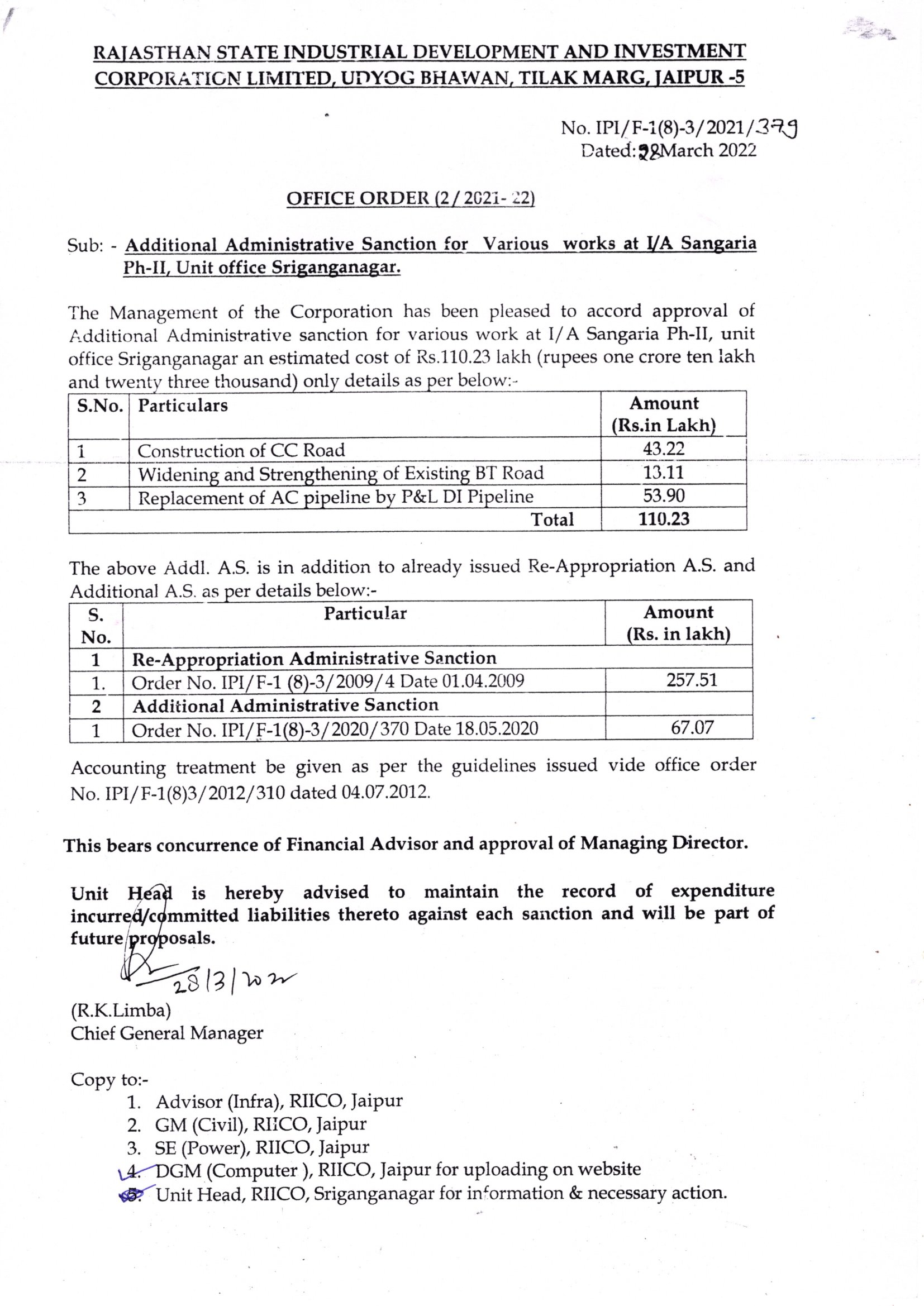 Additional Administrative Sanction for Improvement of road shoulders at I/A Chopanki, Unit Office Bhiwadi-II. |