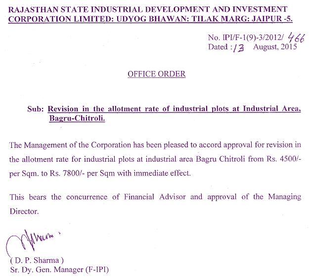 Revision in the allotment rate of industrial plots at Industrial Area, Bagru-Chitroli |