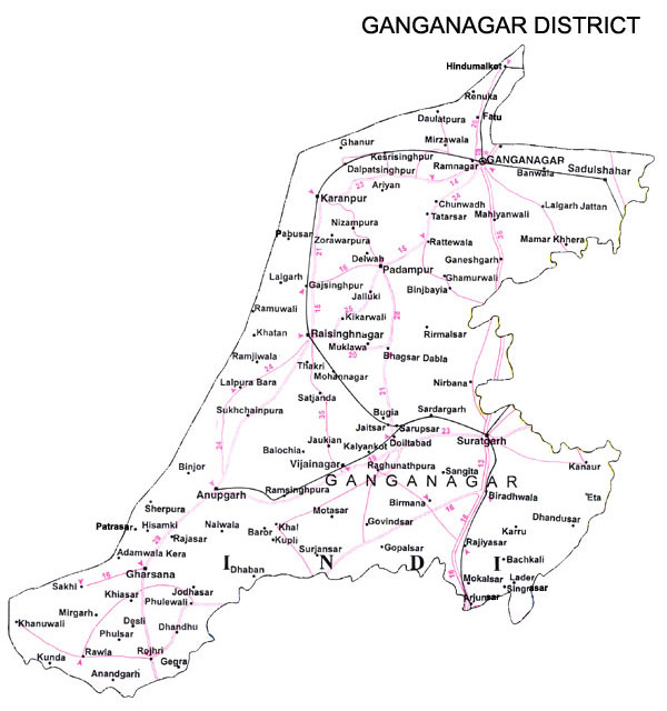 Sri Ganganagar is a northern most city of Rajasthan State of western India . Sri Ganganagar is situated at the point where the Satluj Waters enters Rajasthan. It is surrounded by on the east by Hanumangarh District, (Hanumangarh district was carved out of it on July 12, 1994) on the south by Bikaner District, and on the west by Bahawalnagar district of Pakistani Punjab and on north by Punjab.