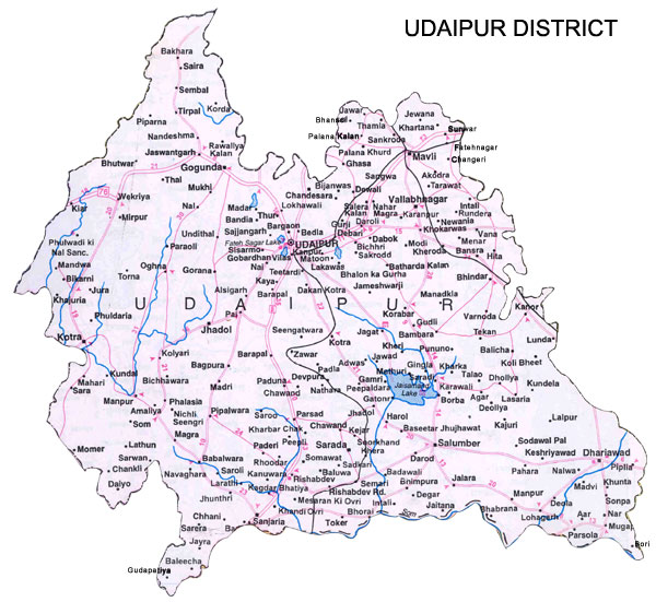 Udaipur district is situated in the southern tip of Rajasthan adjoining Gujarat and is oval in shape with a very narrow strip stretching towards the north. It is bound in the north by Rajsamand and Pali districts, in the south by Dungarpur and Banswara, in the east by Bhilwara and Chiittorgarh and on the west by Pali and Sirohi districts and Sabarkantha district of Gujarat.