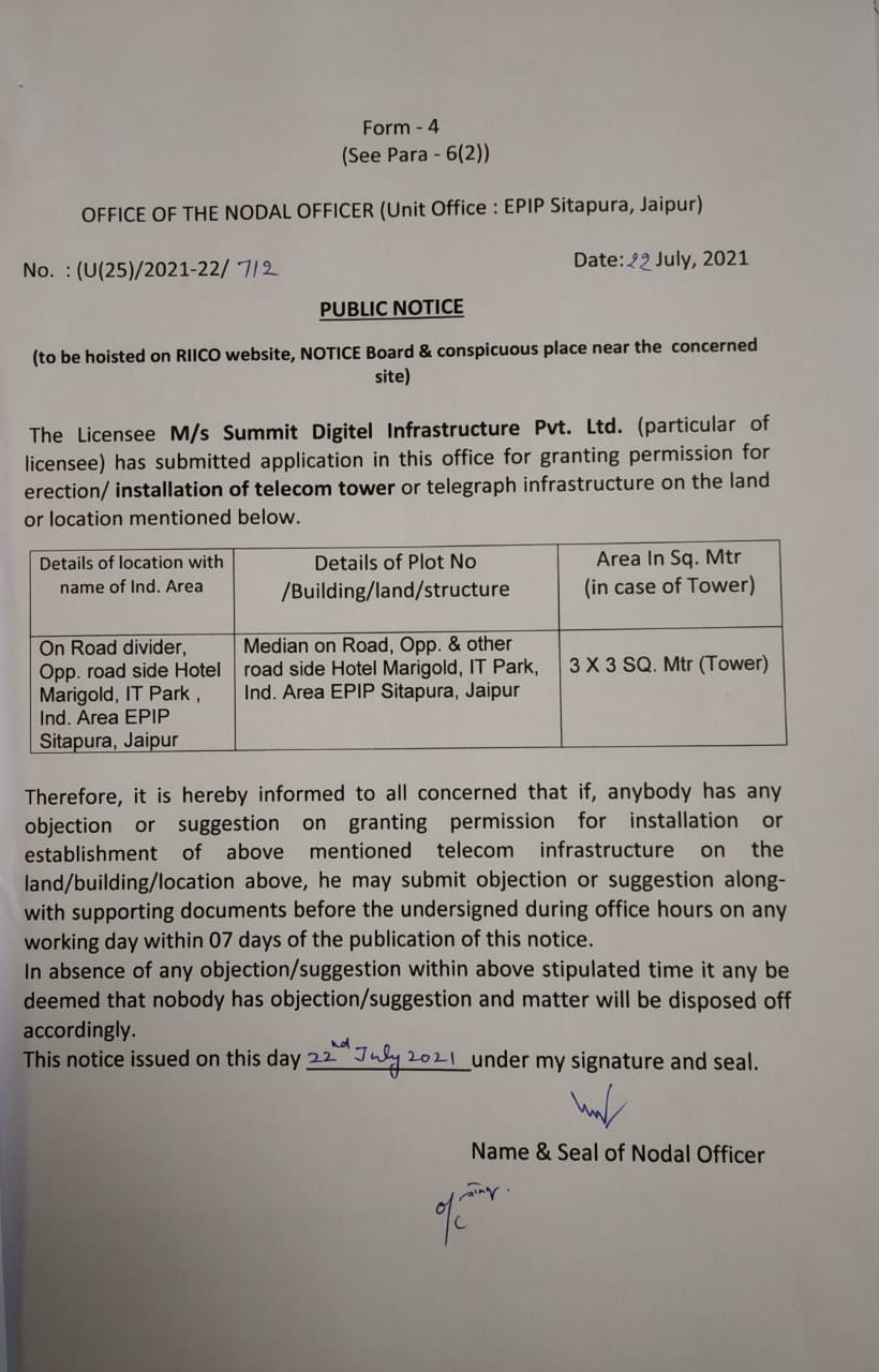 Permission Granted to M/s Summit Digitel Infrastucture Pvt. Ltd. for erection/installation of telecom tower/telegraph infrastructure (GBM) at IT Park, Industrial Area EPIP Sitapura, Jaipur