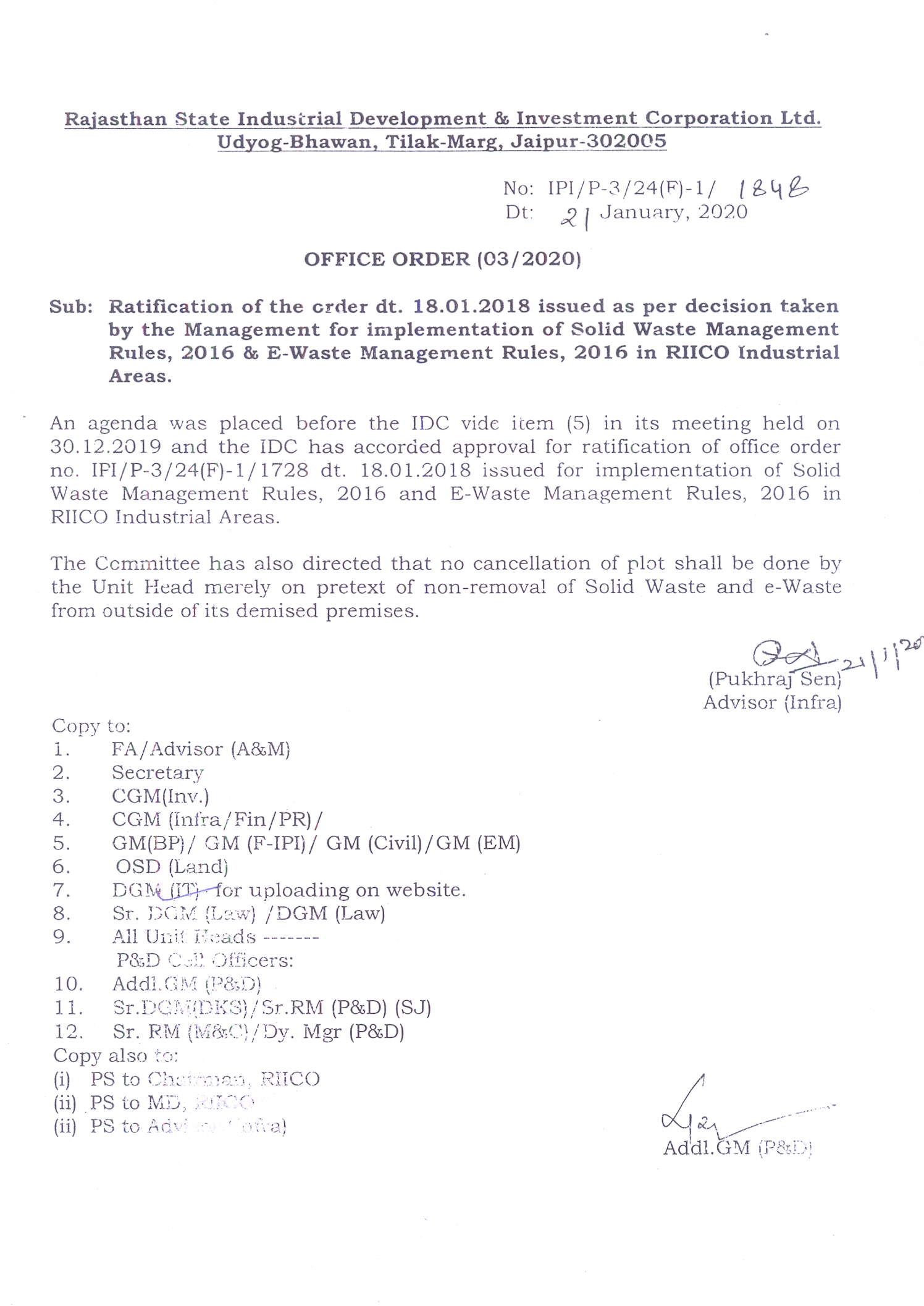 Implementation of Solid Waste Management Rules, 2016 and E-Waste Management Rules, 2016 in RIICO Industrial Areas Corrigendum |
