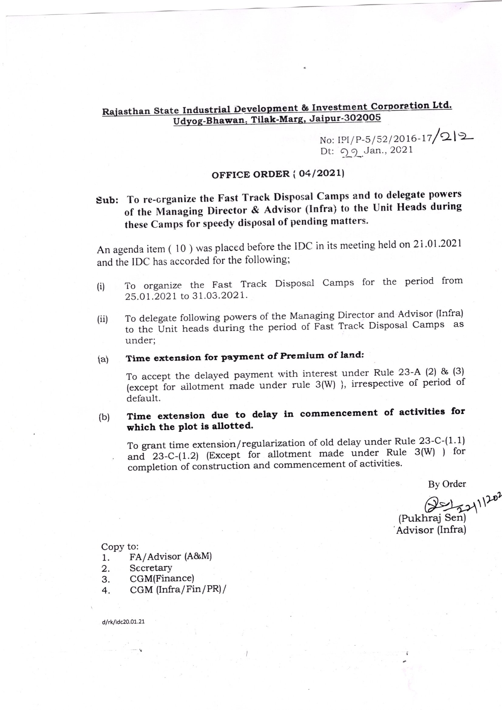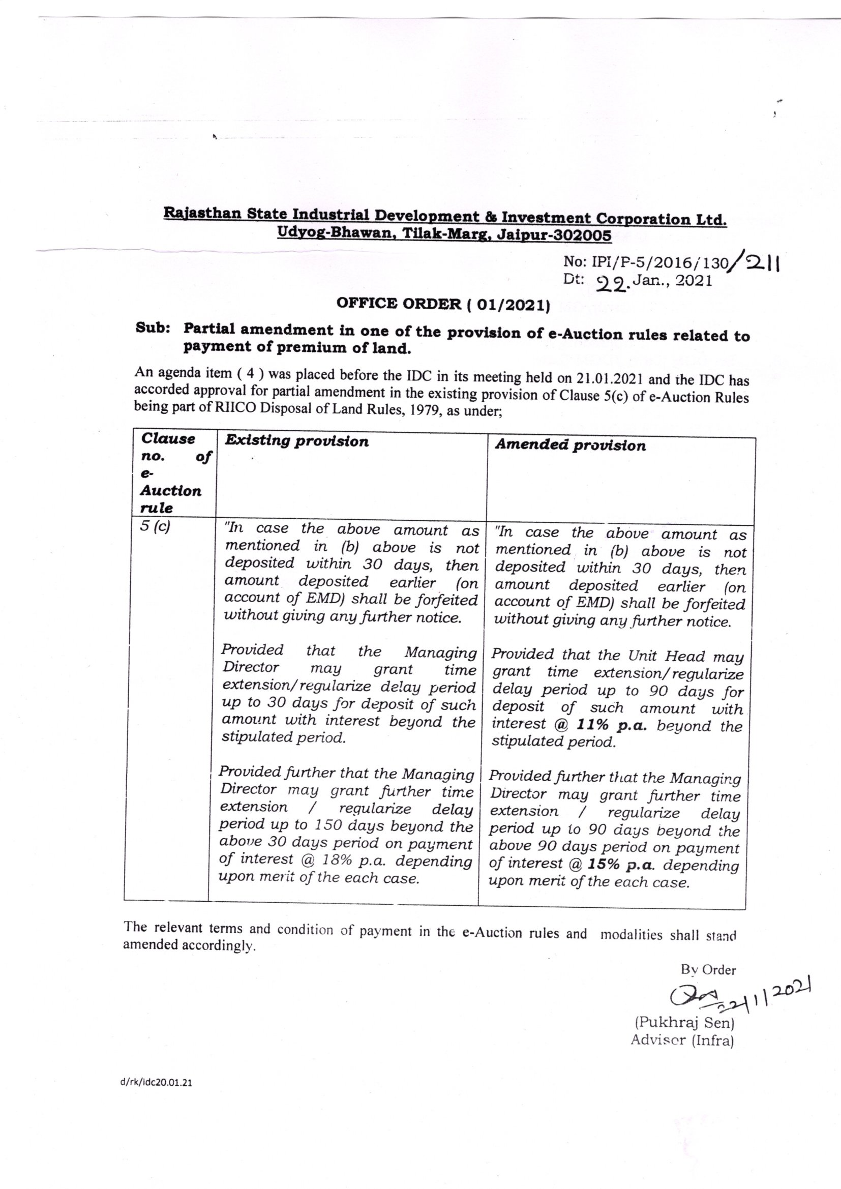 Review of the decision taken by the IDC vide item (9) of its meeting held on 21.01.2021 to the extent of partial amendment in the existing provision of Rule 3(A) of RIICO Disposal of Land Rules, 1979 related to reservation of industrial plots and upfront conession on the rate quoted by the successful bidder in e-Auction of reserved industrial plots |