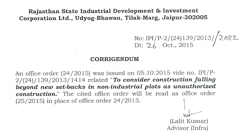 Corrigendum – 'To consider construction falling beyond new set-backs in non-industrial plots as unauthorized construction' |