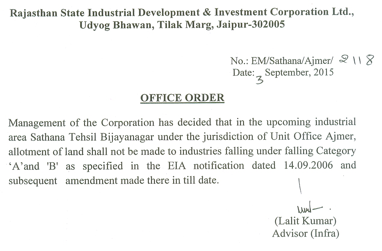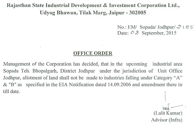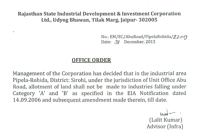 Categorision of upcoming Indl. Area - Udwariya, Abu Road