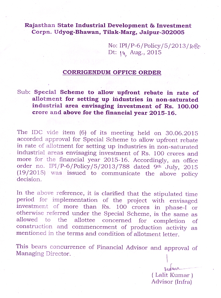 Special Scheme to allow upfront rebate in rate of allotment for setting up industrial in non-saturated industrial area envisaging investment of Rs. 100.00 crore and above for the financial year 2015-16