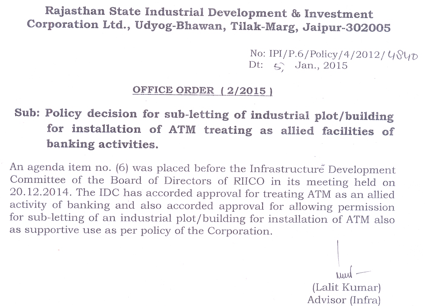 Policy decision for sub-letting of industrial plot/building for installation of ATM treating as allied facilities of banking activities