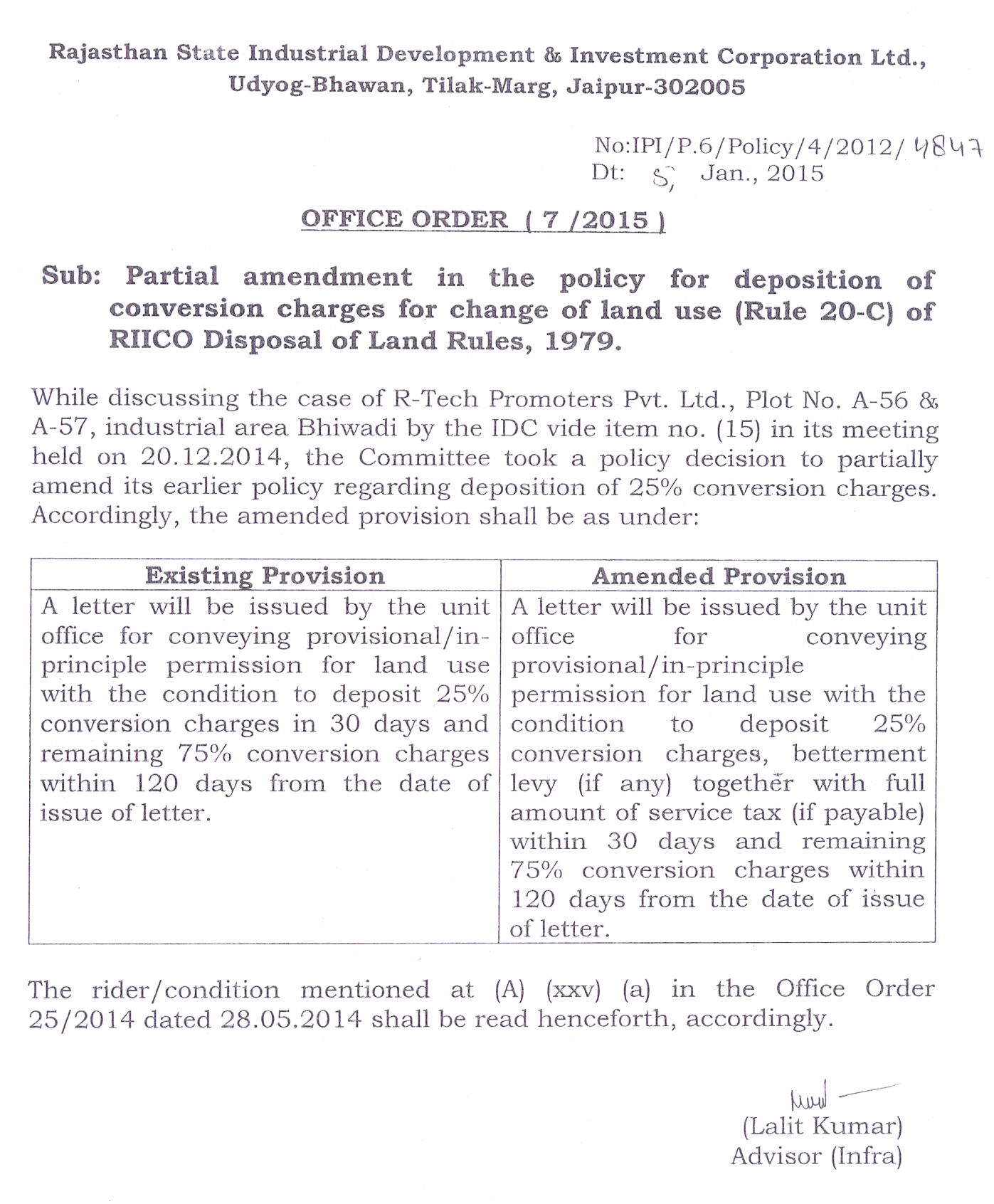 Partial amendment in the policy for deposition of conversion charges for change of land use (Rule-20-C) of RIICO Disposal of Land Rule, 1979