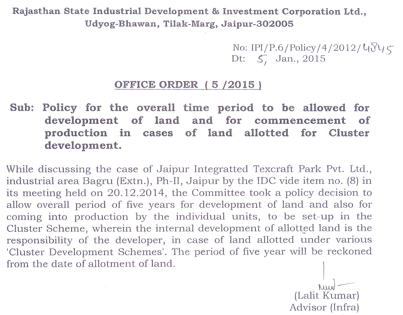 Policy for the overall time period to be allowed for development of land and for commencement of production in cases of land allotted for Cluster development