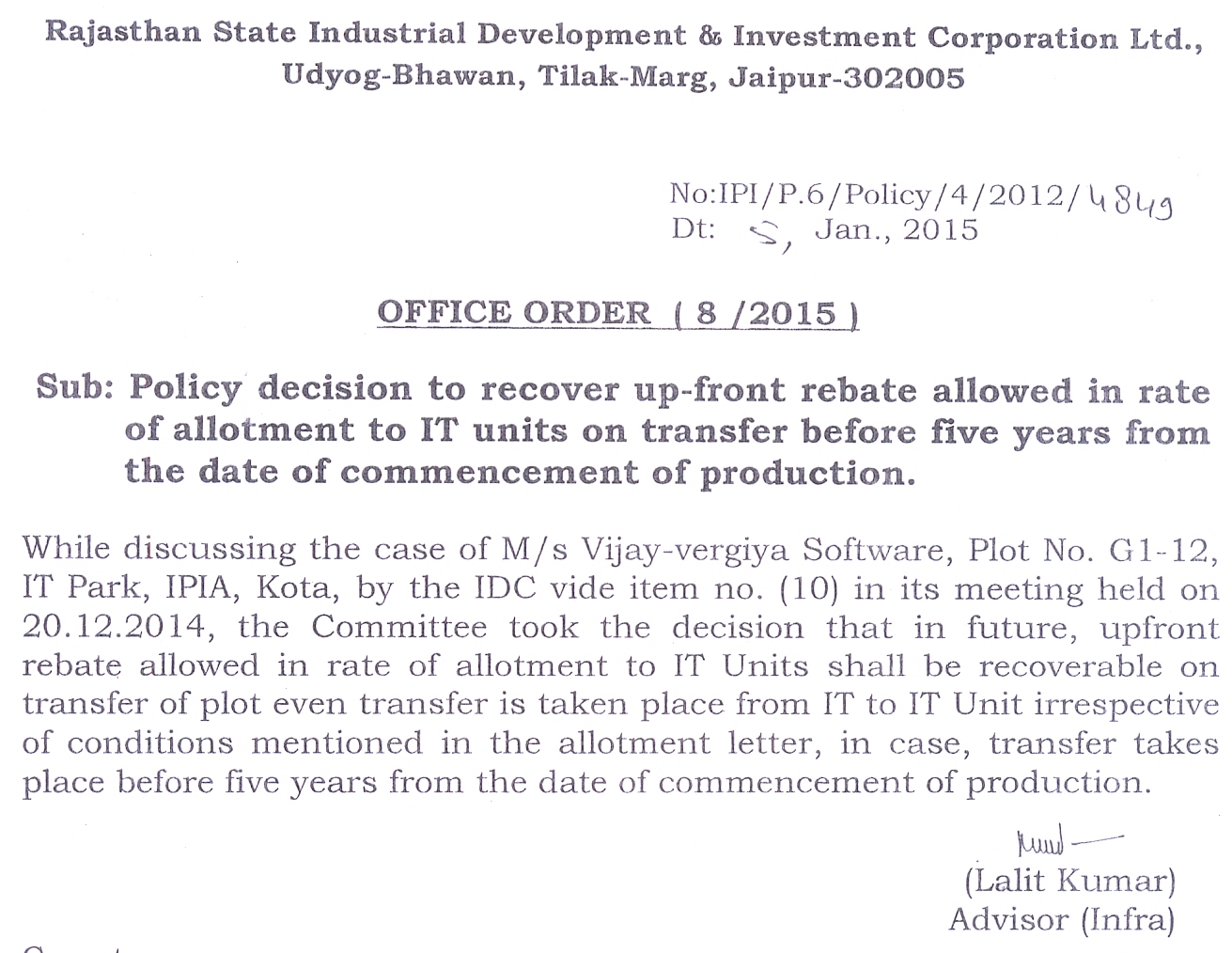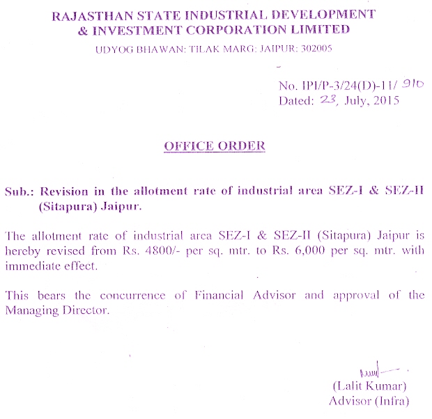 Revision in the allotment rate of industrial area SEZ-I & SEZ-II (Sitapura), Jaipur