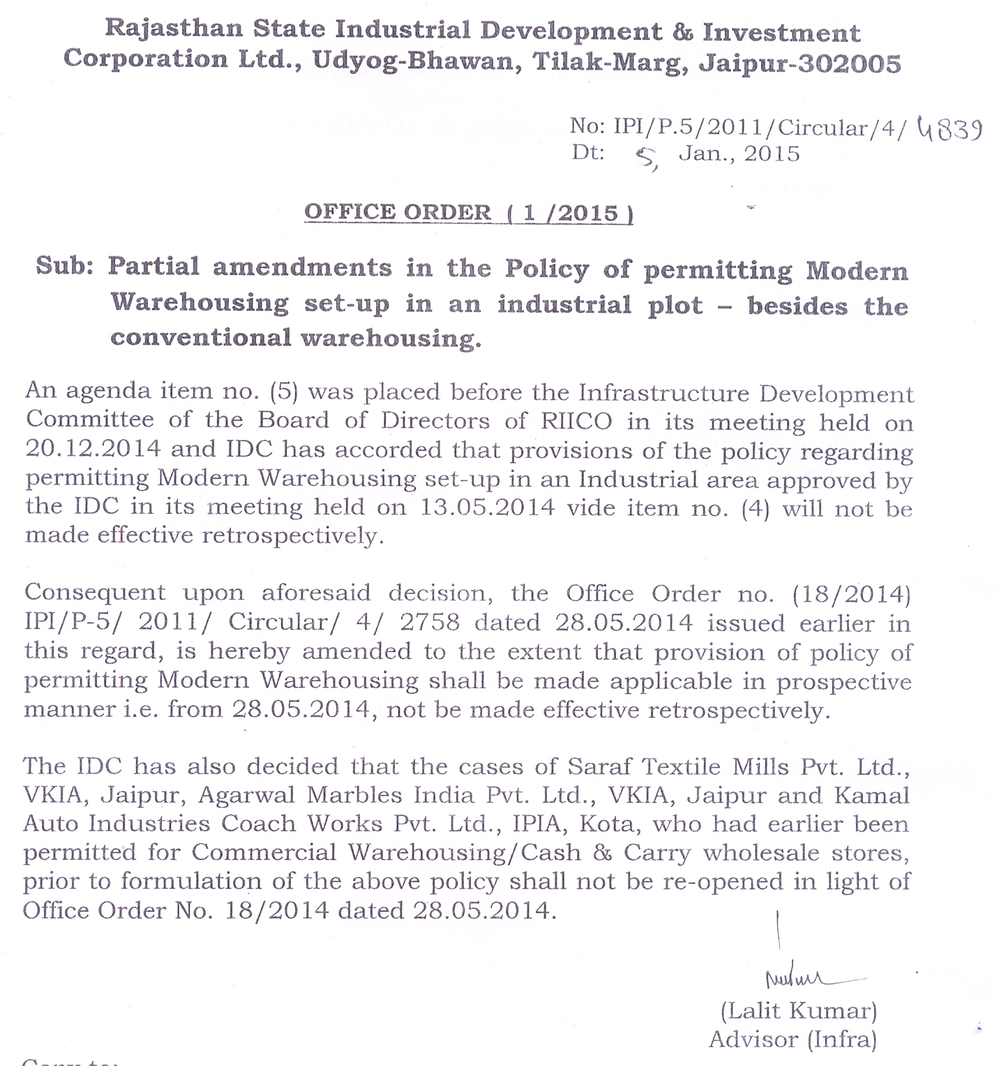 Partial amendments in the Policy of permitting Modern Warehousing set-up in an industrial plot – besides the conventional warehousing