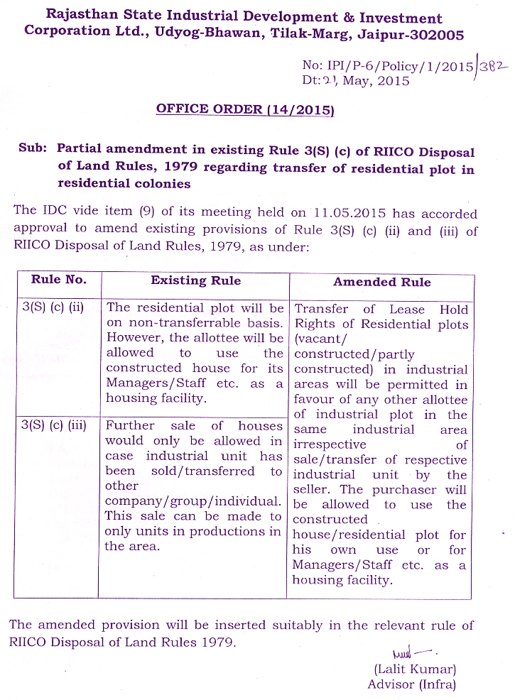 Partial amendment in existing Rule 3(S) (c) of RIICO Disposal of Land Rules, 1979 regarding transfer of residential plot in residential colonies
