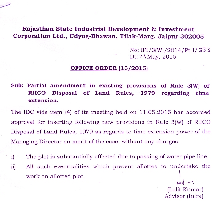 Partial amendment in existing provisions of Rule 3(W) of RIICO Disposal of Land Rules, 1979 regarding time extension