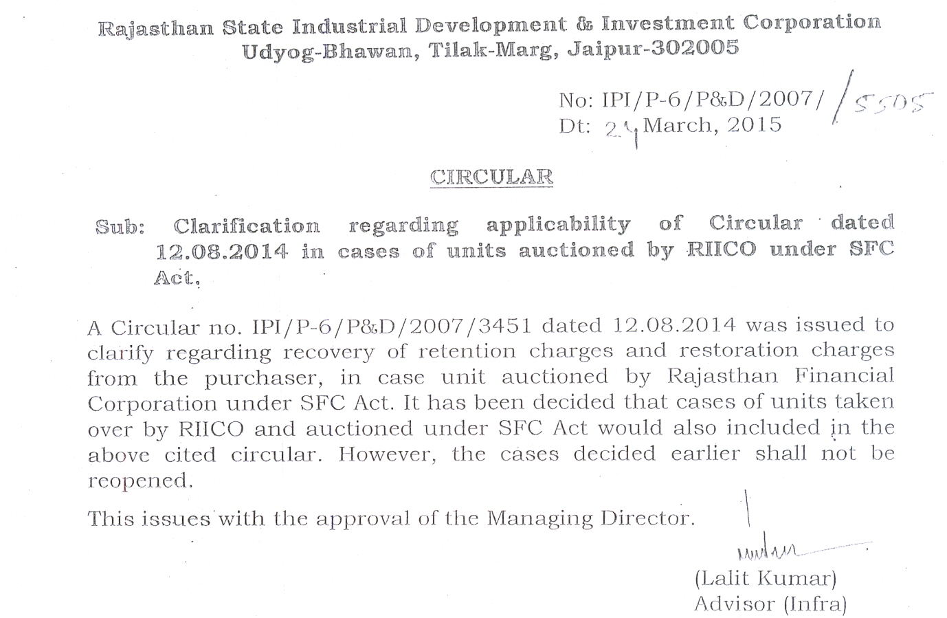 Clarification regarding applicability of Circular dated 12.08.2014 in cases of units auctioned by RIICO under SFC Act.
