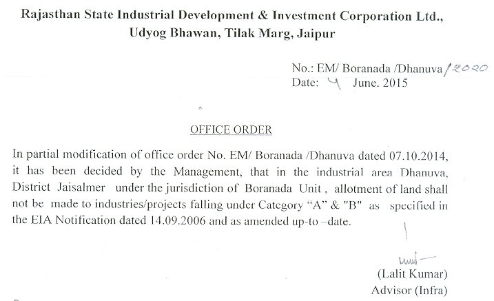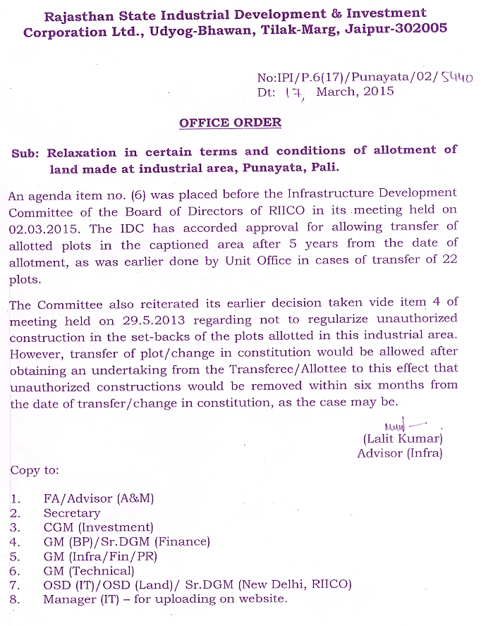 Relaxation in certain terms and consitions of allotment of land made at industrial area, Punayata, Pali