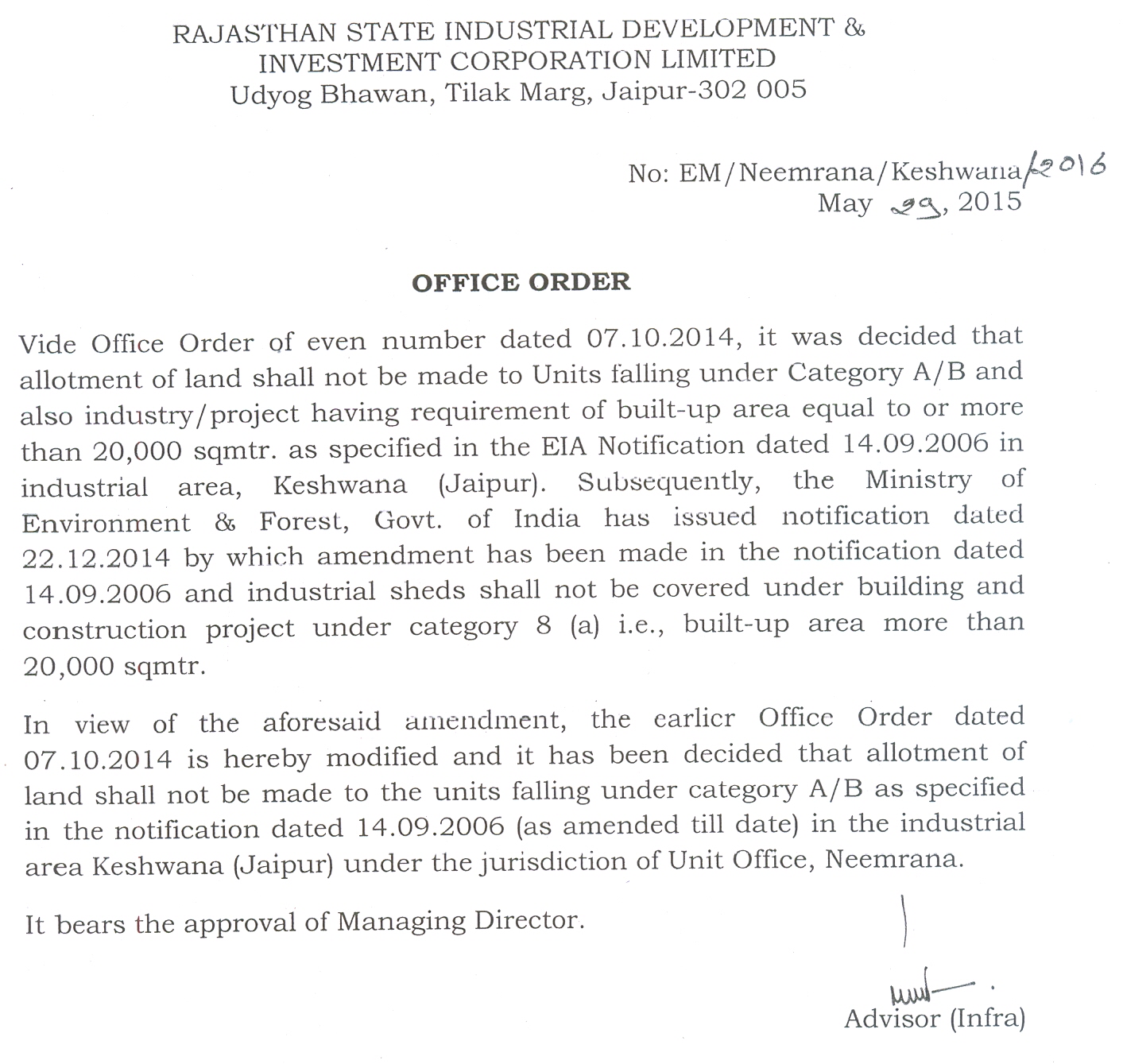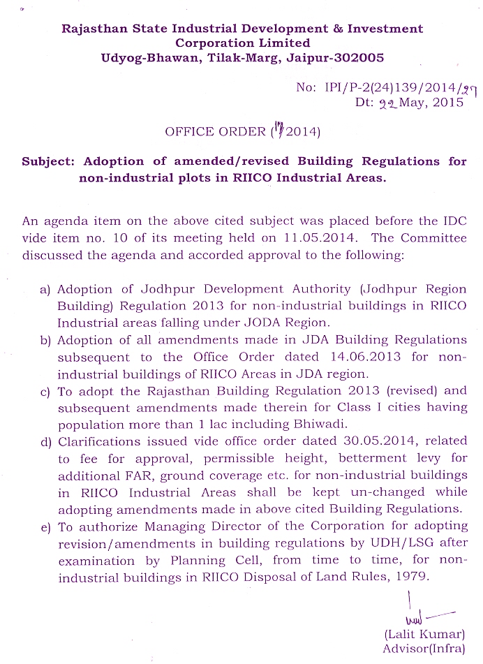 Adoption of amended/revised Buiding Regulations for non-industrial plots in RIICO Industrial Areas