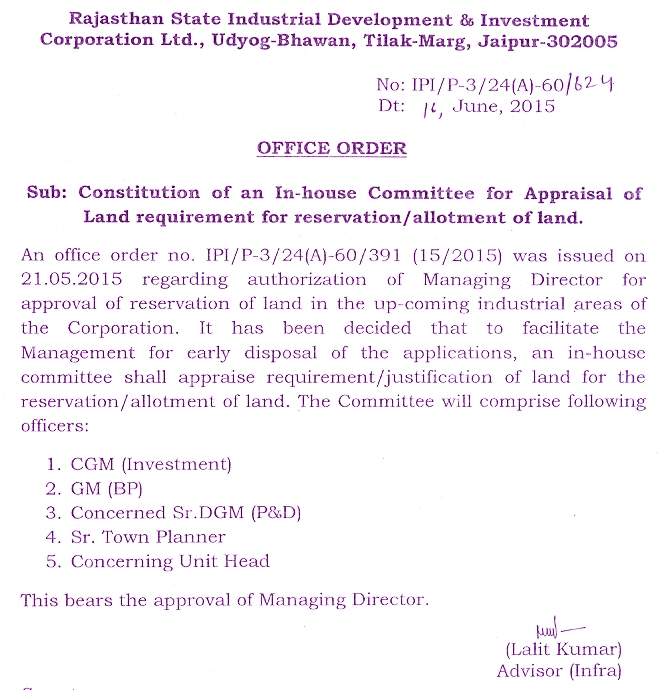 Constitution of an In-house Committee for Appraisal of Land requirement for reservation/allotment of land