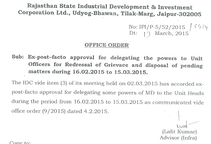 Ex-post-facto approval for delegating the powers to Unit Officers for Redresses of Grievance and disposal of pending matters during 16.02.2015 to 15.03.2015