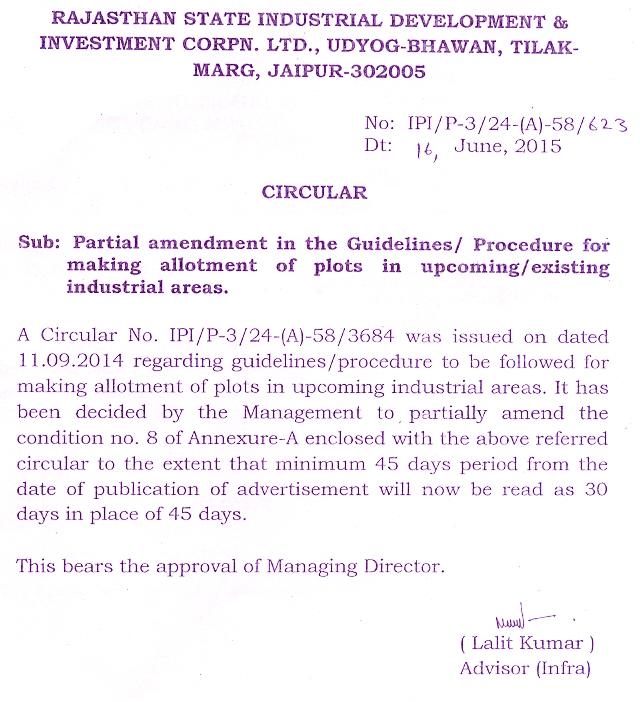 Partial amendment in the Guidelines/Procedure for making allotment of plots in upcoming/existing industrial areas