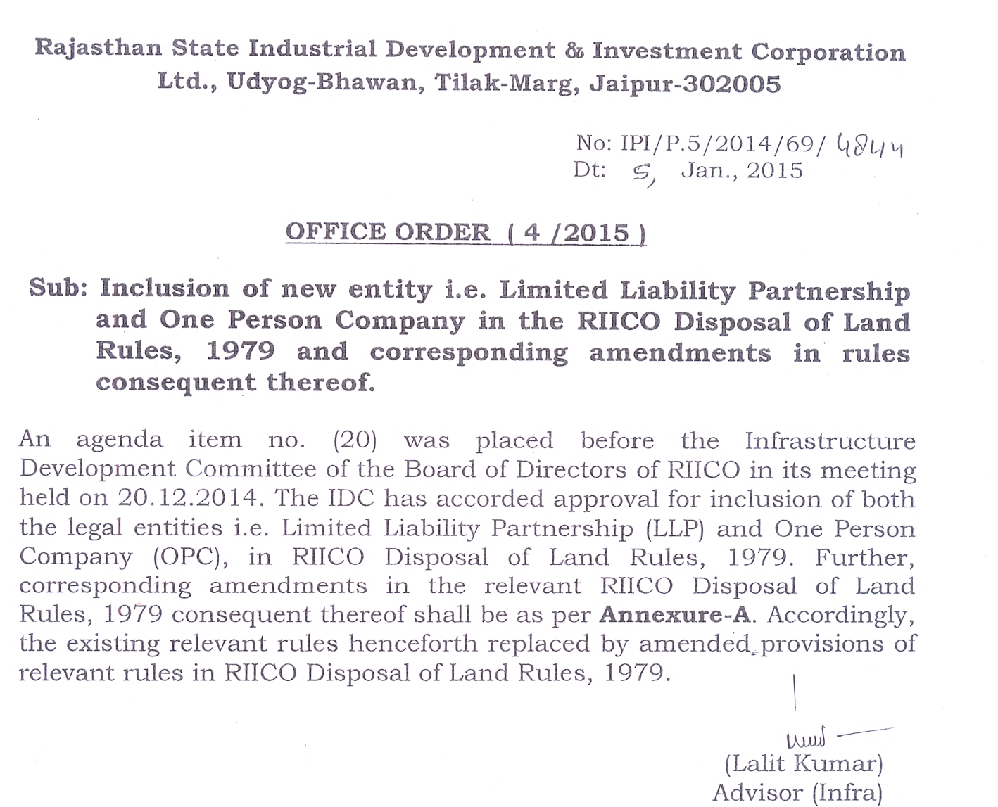 Inclusion of new entity i.e. Limited Liability Partnership and One Person Company in the RIICO Disposal of Land Rules, 1979 and corresponding amendments in rules consequent thereof