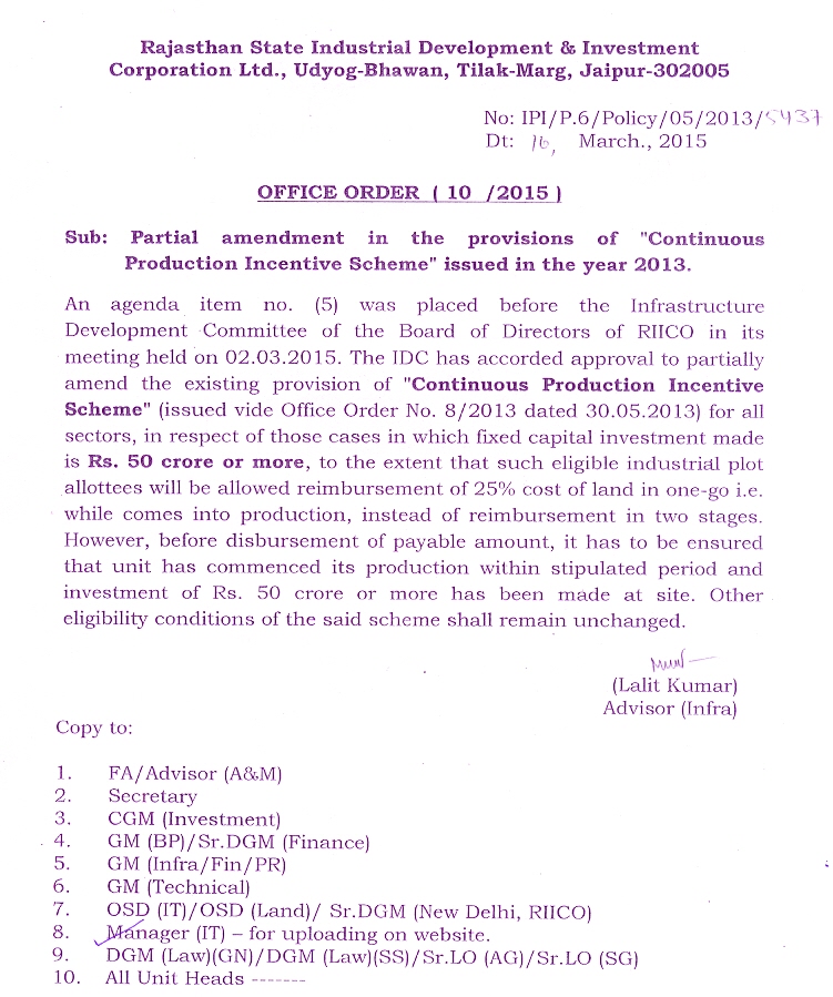 Partial amendment in the provisions of 'Continuous Production Incentive Scheme' issued in the year, 2013