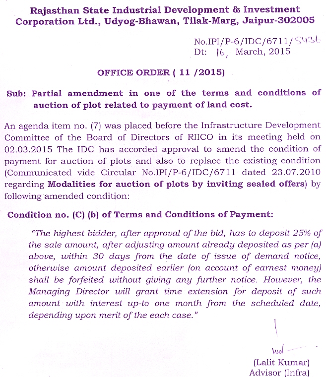 Partial amendment in one of the terms and conditions of auction of plot related to payment of land cost