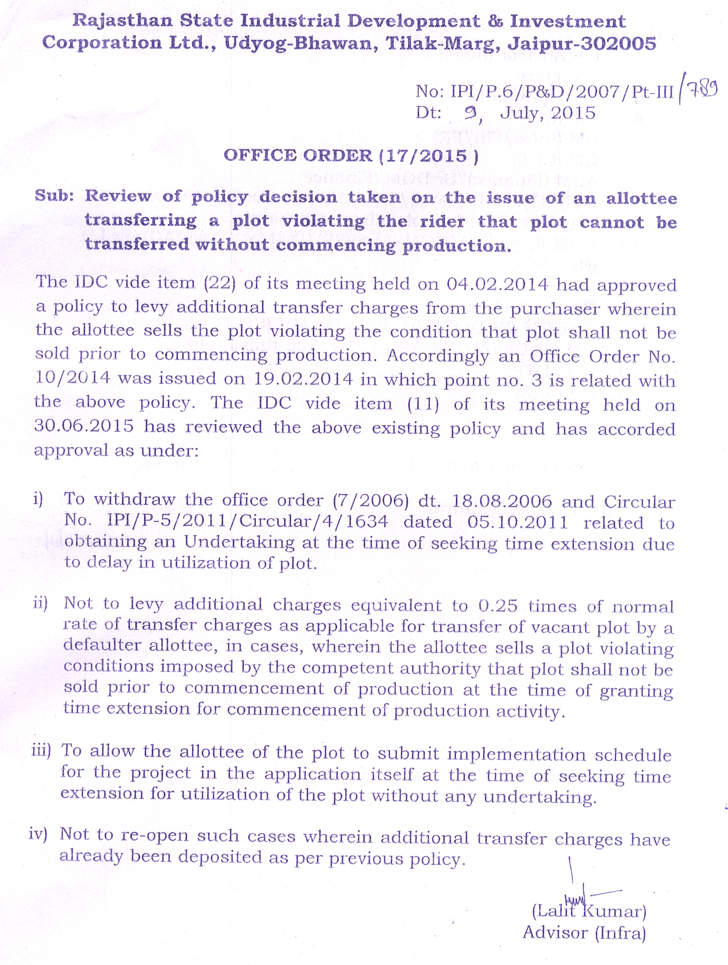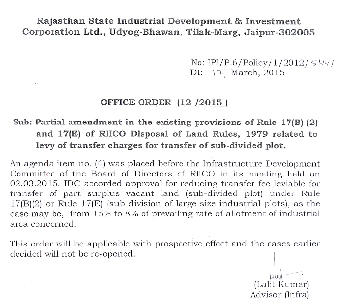 Partial amendment in the existing provisions of Rule 17(B) (2) and 17(E) of RIICO Disposal of Land Rules, 1979 related to levy of transfer charges for transfer of sub-divided plot