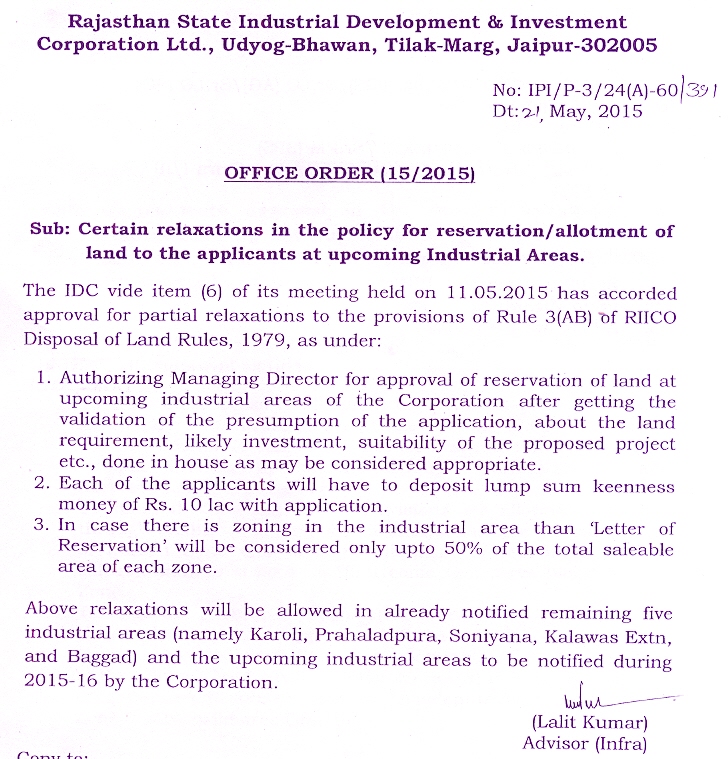 Certain relaxation in the policy for reservation/allotment of land to the applications at upcoming Industrial Areas