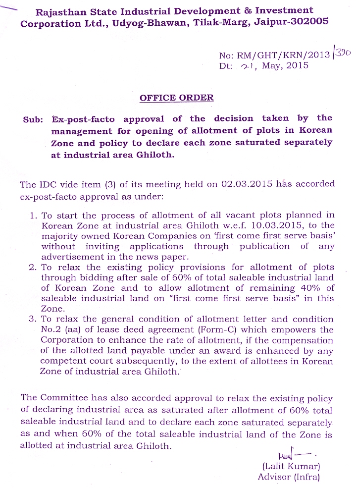 Ex-post-facto approval of the decision taken by the management for opening of allotment of plots in Korean Zone and policy to declare each zone saturated separately at industrial area Ghiloth