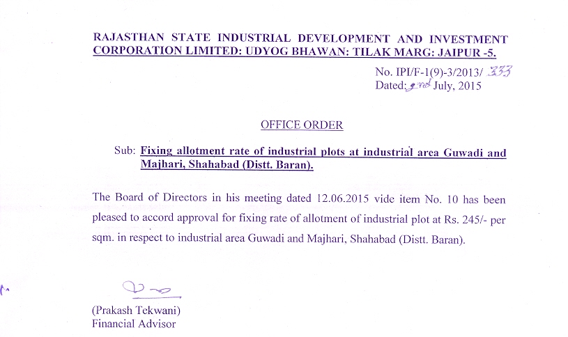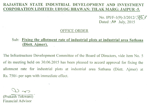 Fixing the allotment rate of industrial plots at industrial area Sathana (Dist. Ajmer) |