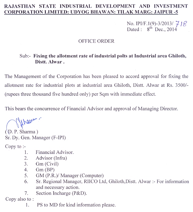 Fixing the allotment rate of industrial plots at Industrial area Ghiloth, Distt.Alwar |