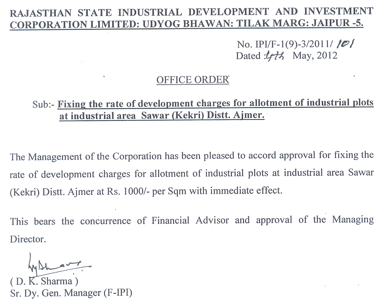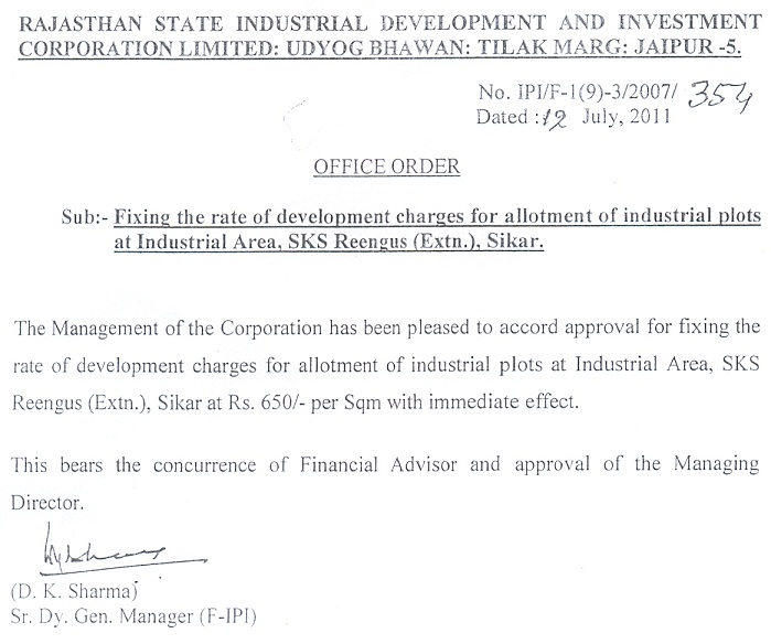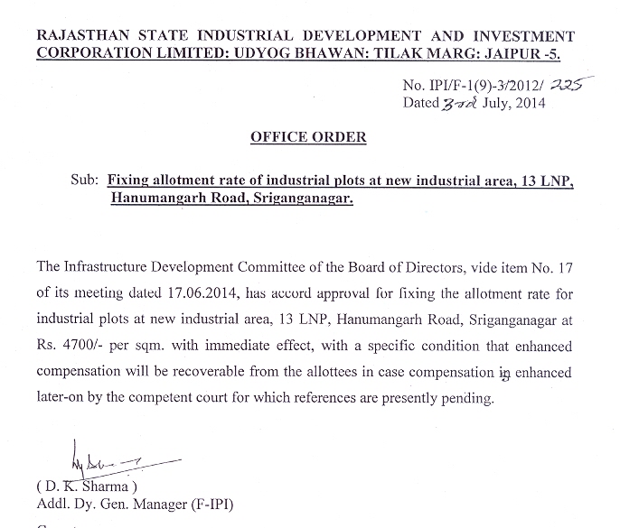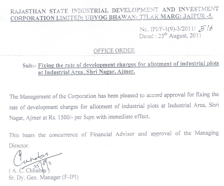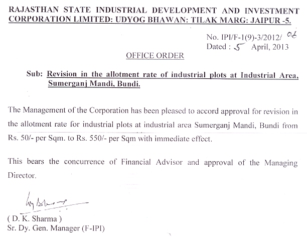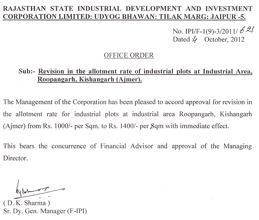 Revision in the allotment rate of industrial plots at Industrial Area,Roopangarh, Kishangarh (Ajmer) |