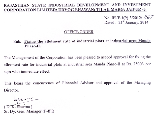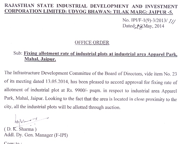 Fixing allotment rate of industrial plots at industrial area Apparel Park,Mahal, Jaipur |