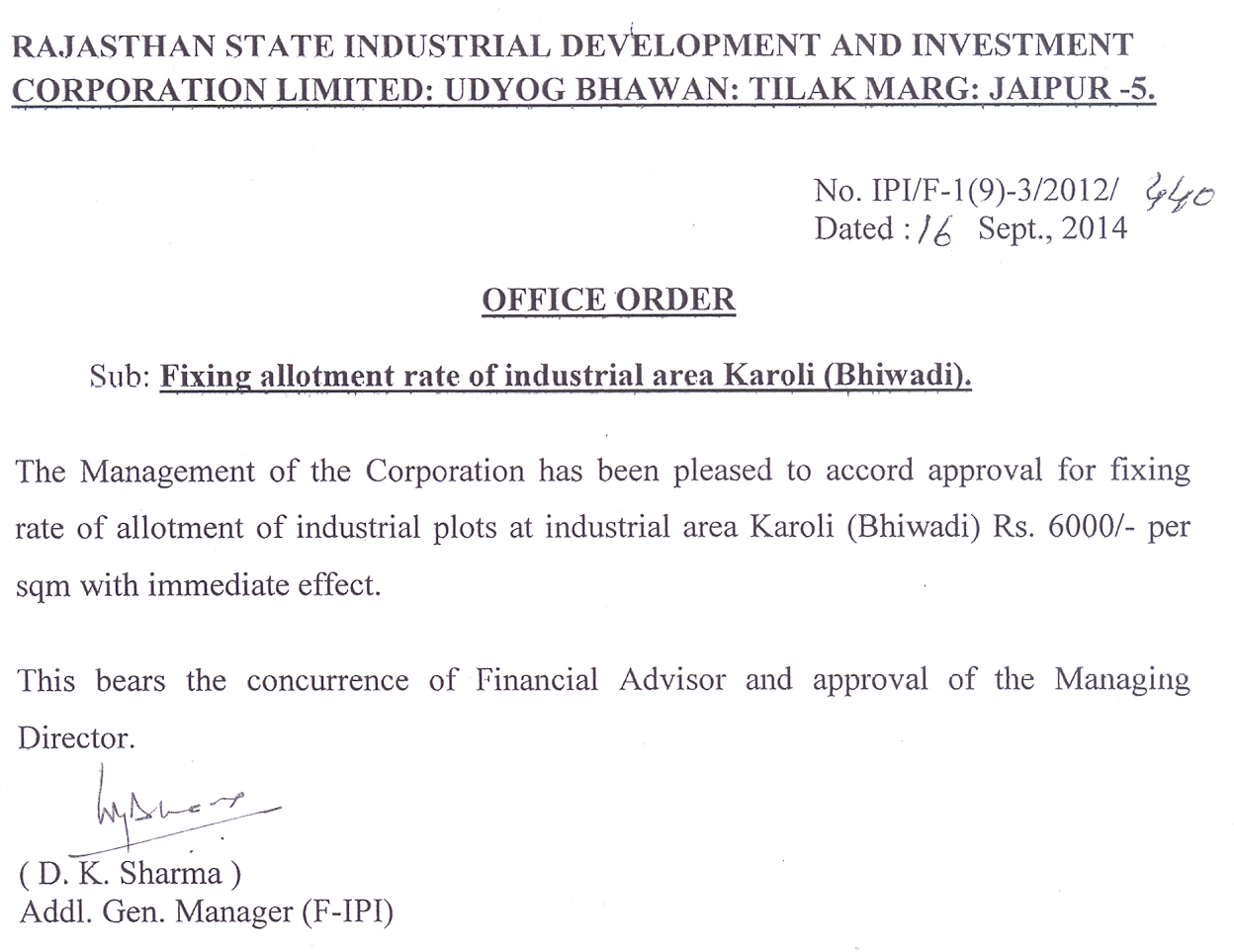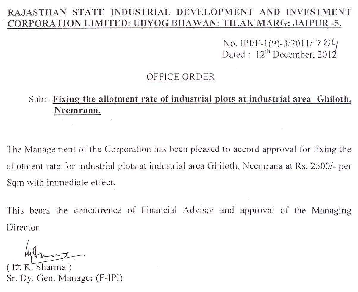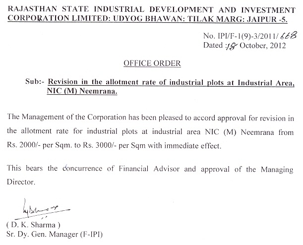 Revision in the allotment rate of industrial plots at Industrial Area, NIC (M) Neemrana |