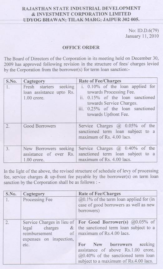 Revision in Structure of Service Charges on Term Loan Sanction |