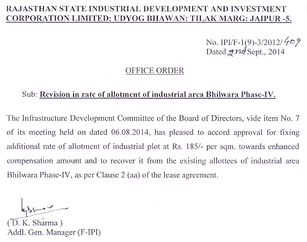 Revision in rate of allotment of industrial area Bhilwara Phase-IV |