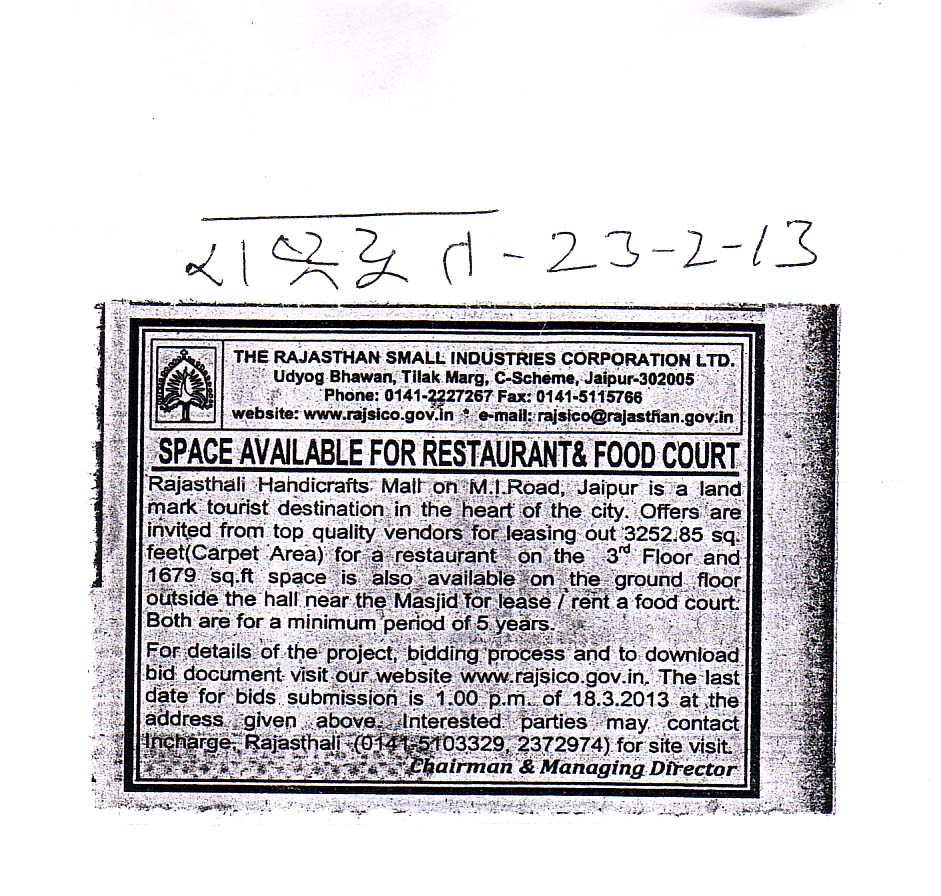 | Tender for Houskeeping , Sweeping and cleaning at Rajasthali & Rajasthali mall MI Road Ajmeri gate Jaipur |