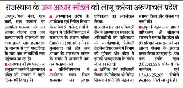 राजस्थान के जन आधार मॉडल को लागू करेगा अरुणाचल प्रदेश