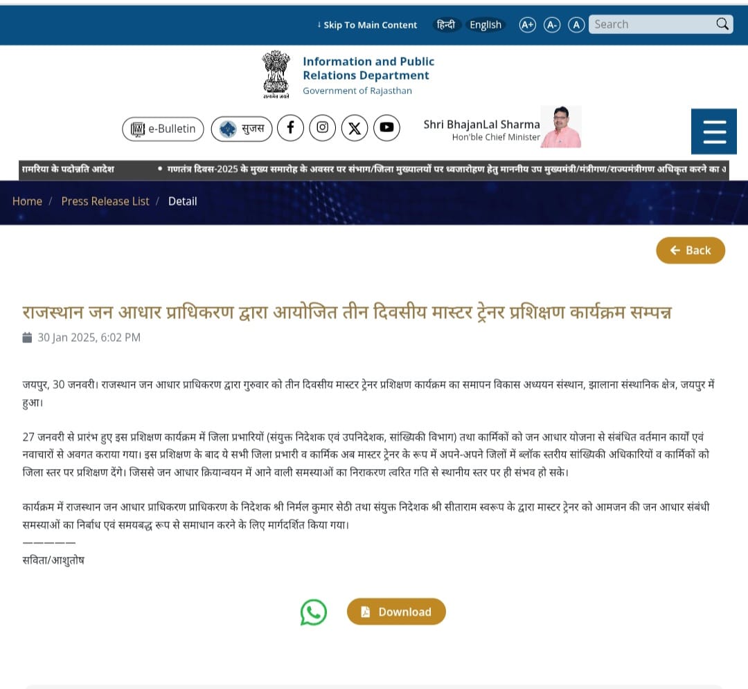 राजस्थान जन आधार प्राधिकरण द्वारा आयोजित तीन दिवसीय मास्टर ट्रेनर कार्यक्रम प्रशिक्षण सम्पन्न