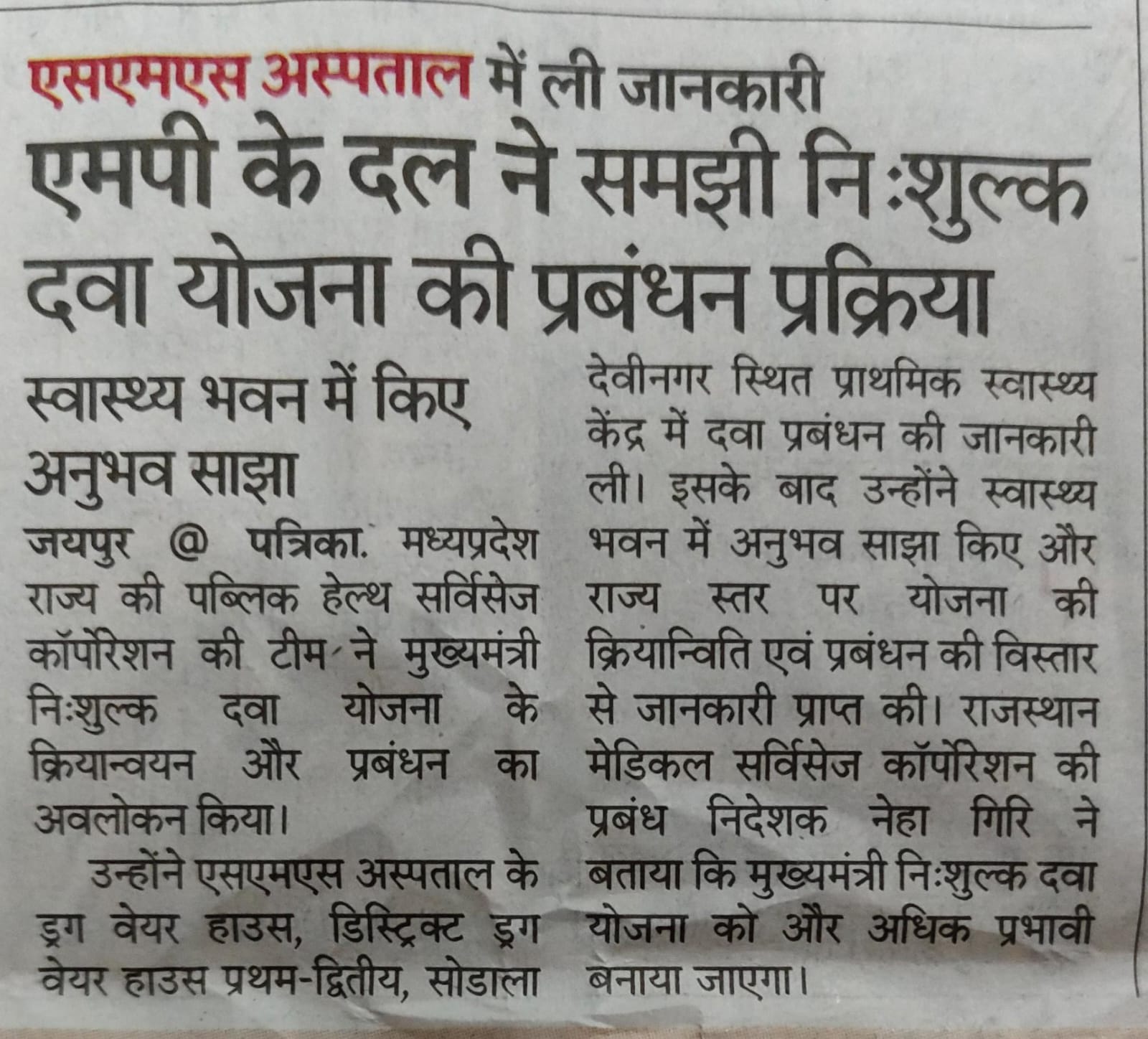 The team of Madhya Pradesh Public Health Services Cor-poration, which came to Jaipur to study the Chief Minister's Free Medicine Scheme in the state, shared the experiences of its two-day visit on Wednesday.