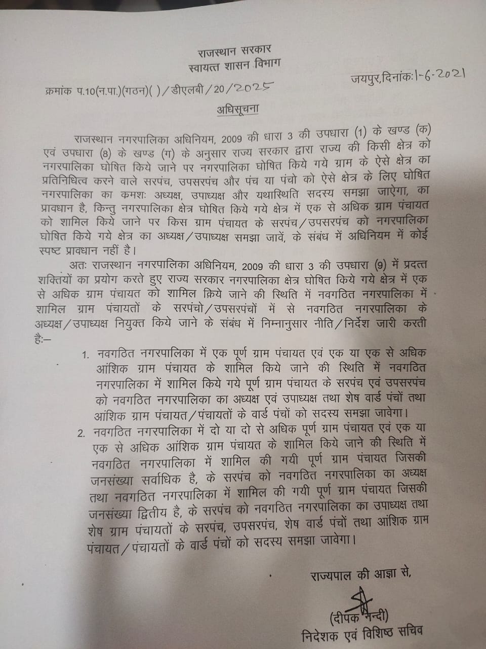 | राज्य सरकार द्वारा संपूर्ण ग्राम पंचायत पलसाना जिला सीकर क्षेत्र को एतद् द्वारा तत्काल प्रभाव से चतुर्थ श्रेणी की नगर पालिका घोषित जाने बाबत्। | प.10(न.पा.)(गठन)/डीएलबी/24/10131 दिनांक 27.03.2025 | view | |