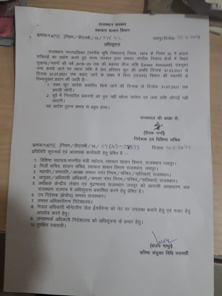 | राजस्थान नगर पालिका अधिनियम 2009 की धारा 107 (4) के अन्तर्गत गृहकर एवं नगरीय विकास कर एक मुश्त राशि जमा कराने पर शास्ति में छूट प्रदान करने के संबंध में। | प.8(ग)(38)नियम/डीएलबी/2019/6922 | view | |