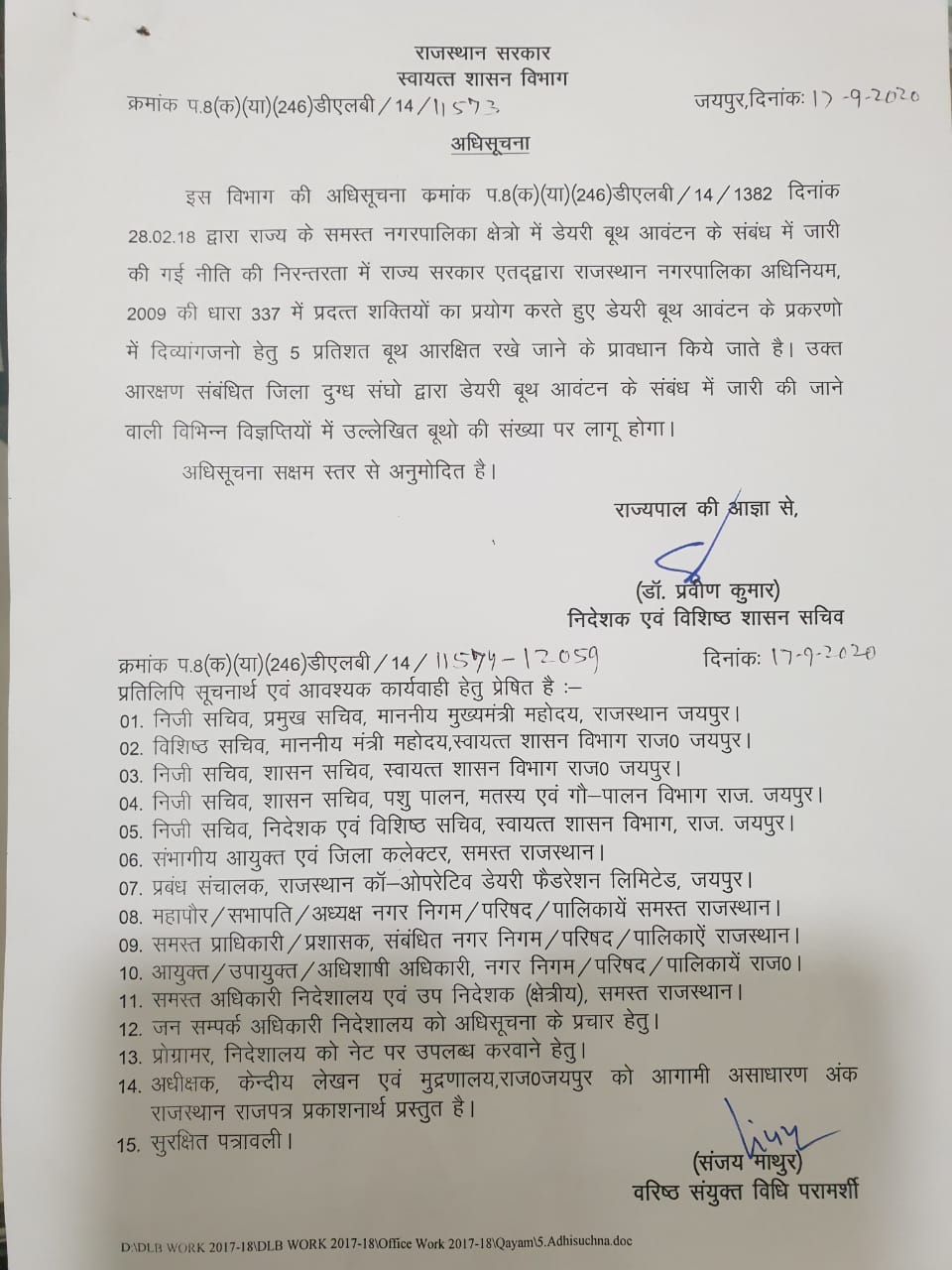 | नगरपालिका क्षेत्र में डेयरी बूथ स्थापित करने, किराया / लीज राशि में वृद्धि, डेयरी बूथों की बेदखली के संबंध में लाईसेन्स जारी करने के प्रयोजनार्थ पूर्व में जारी समसंख्यक अधिसूचना क्रमांक 9329-9347 दिनांक 221021 में नियमानुसार संशोधन | प. 6(ग) नियम / डीएलबी/25/ 4026 | view | |