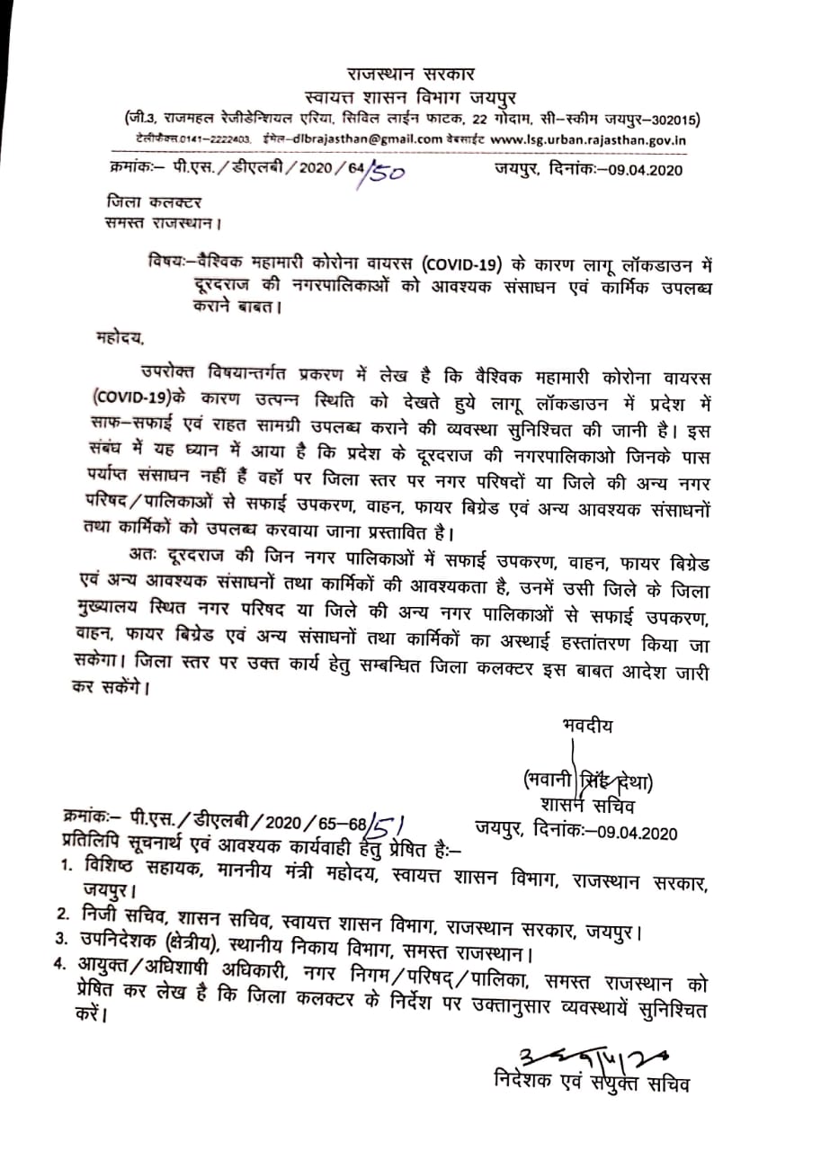 वैष्विक महामारी कोरोना वायरस(COVID-19) के कारण लागू लॉकडाउन में दूरदराज की नगरपालिकाओं को आवष्यक संसाधन एवं कार्मिक उपलब्ध करवाने के संबंध में |
