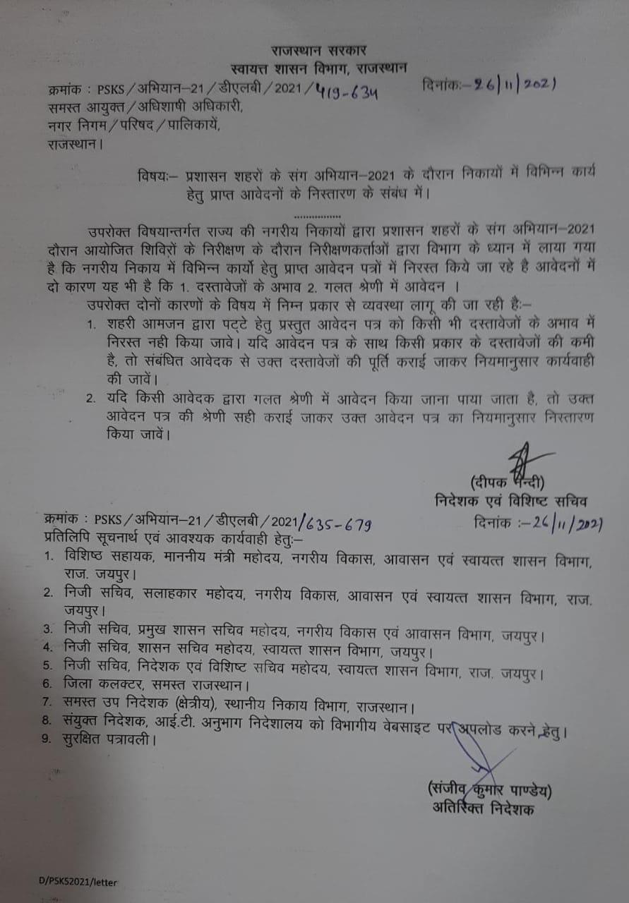 "प्रशासन शहरों के संग अभियान-2021" में कच्ची बस्ती के पट्टे जारी करने के सम्बन्ध में आदेश क्रमांक पीएसकेस अभियान-2021/ /2023-24/2949 दिनांक 25-04-2023 |