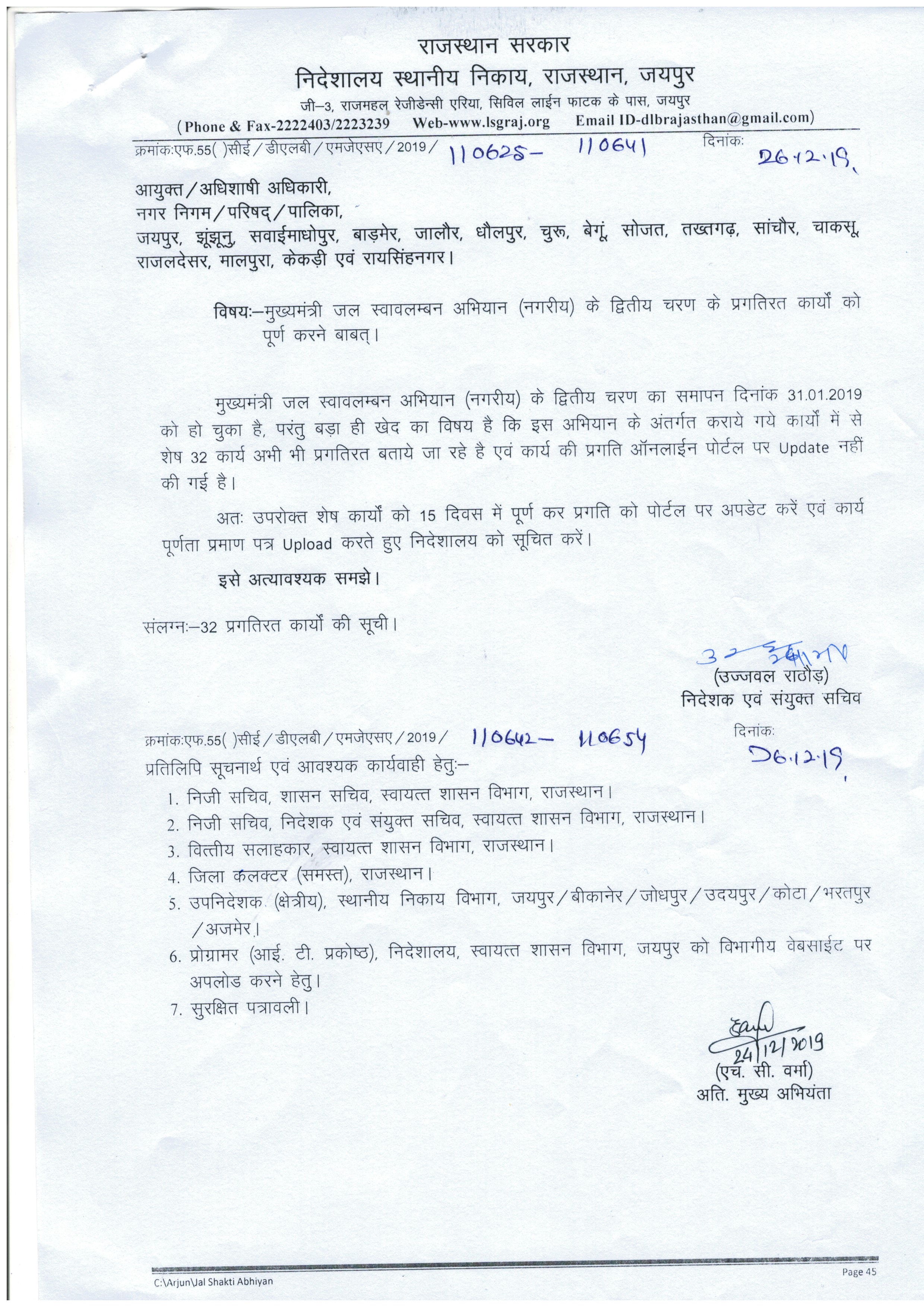 | मुख्यमंत्री जल स्वावलंबन अभियान (नगरीय) के द्वितीय चरण के प्रगतिरत कार्यों को पूर्ण करने बाबत्, no. 110625-110641, Date 26-12-2019 | view | |